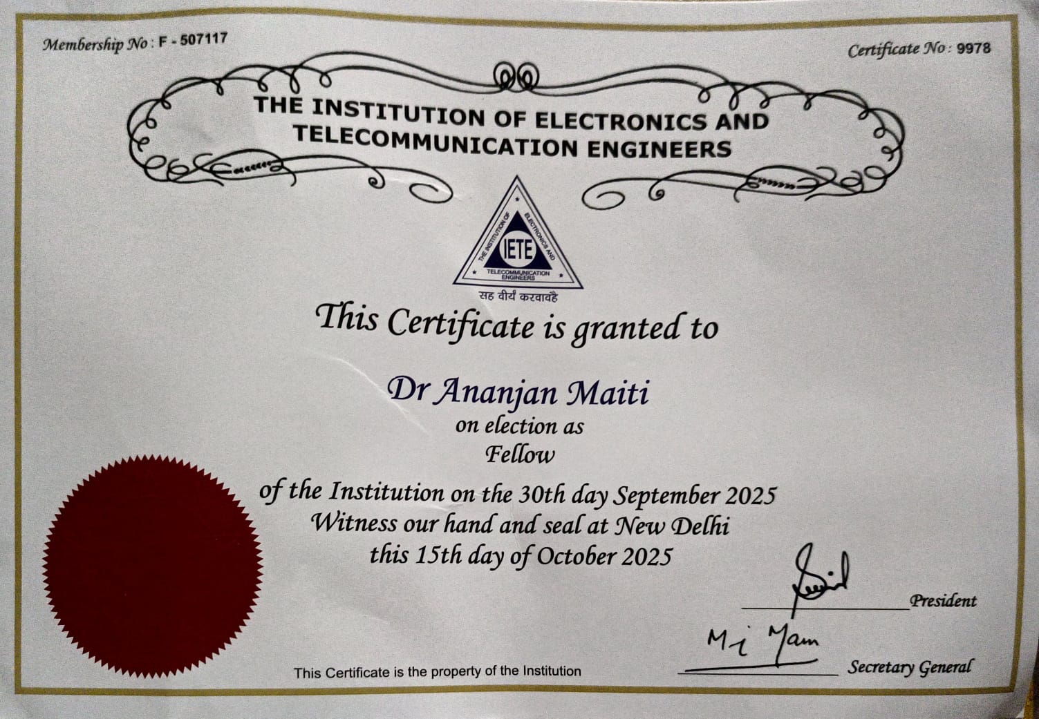 Fellow of the Institution of Electronics and Telecommunication Engineers (IETE) OCT 2025