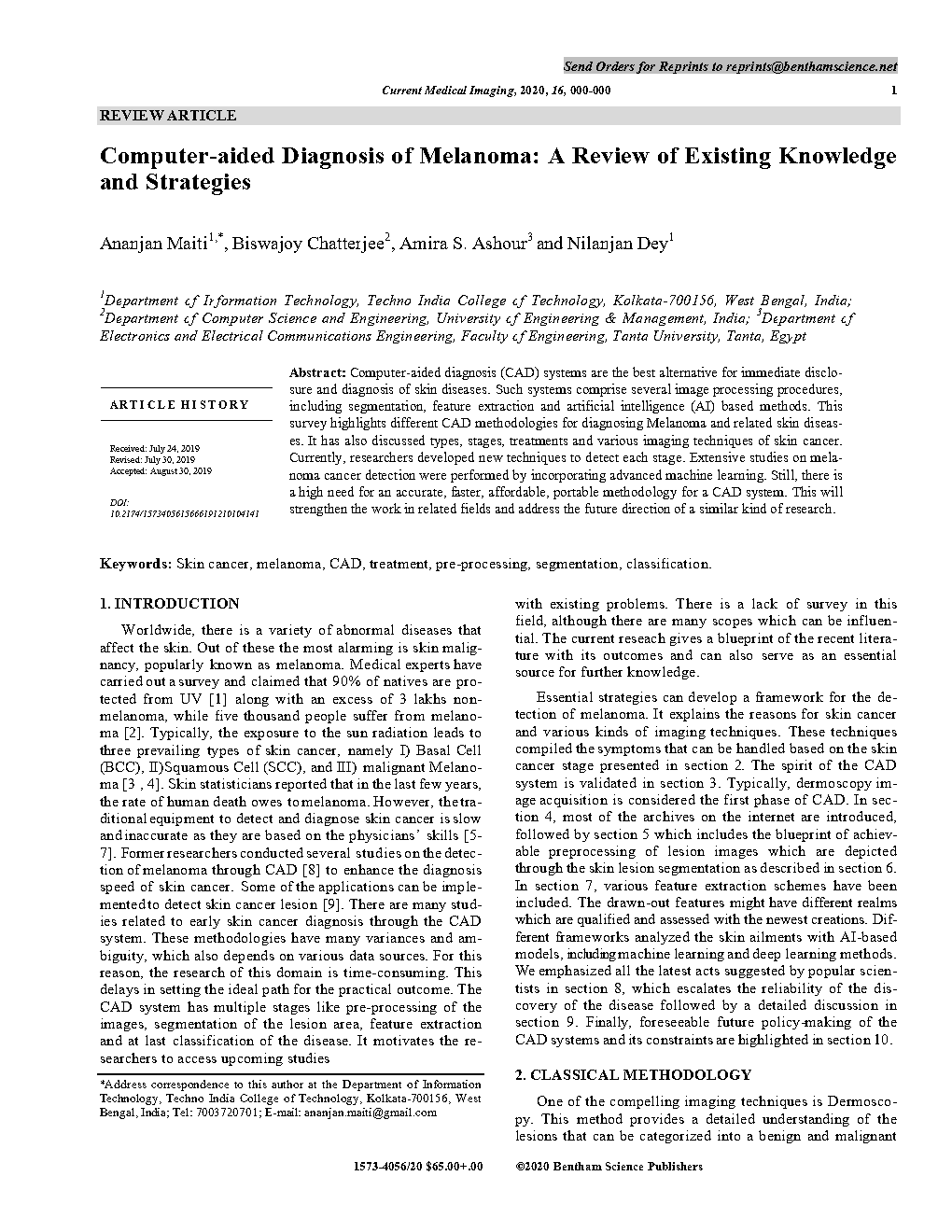 - “Computer-aided Diagnosis of Melanoma: A Review of Existing Knowledge and Strategies” – Current Medical Imaging Reviews, Bentham Science, Dec 10, 2019 A Maiti, B Chatterjee, A S. Ashour and N Dey – DOI: 10.2174/1573405615666191210104141 (SCIE and Scopus Indexed)