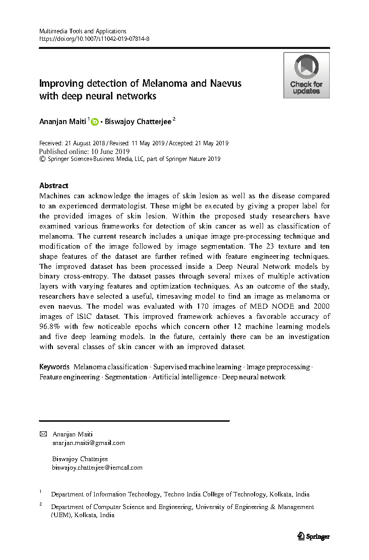 - “Improving Detection of Melanoma and Naevus with Deep Neural Networks”- Multimedia Tools and Applications, Springer, 10 June 2019, A Maiti, B Chatterjee (SCIE and Scopus Indexed)